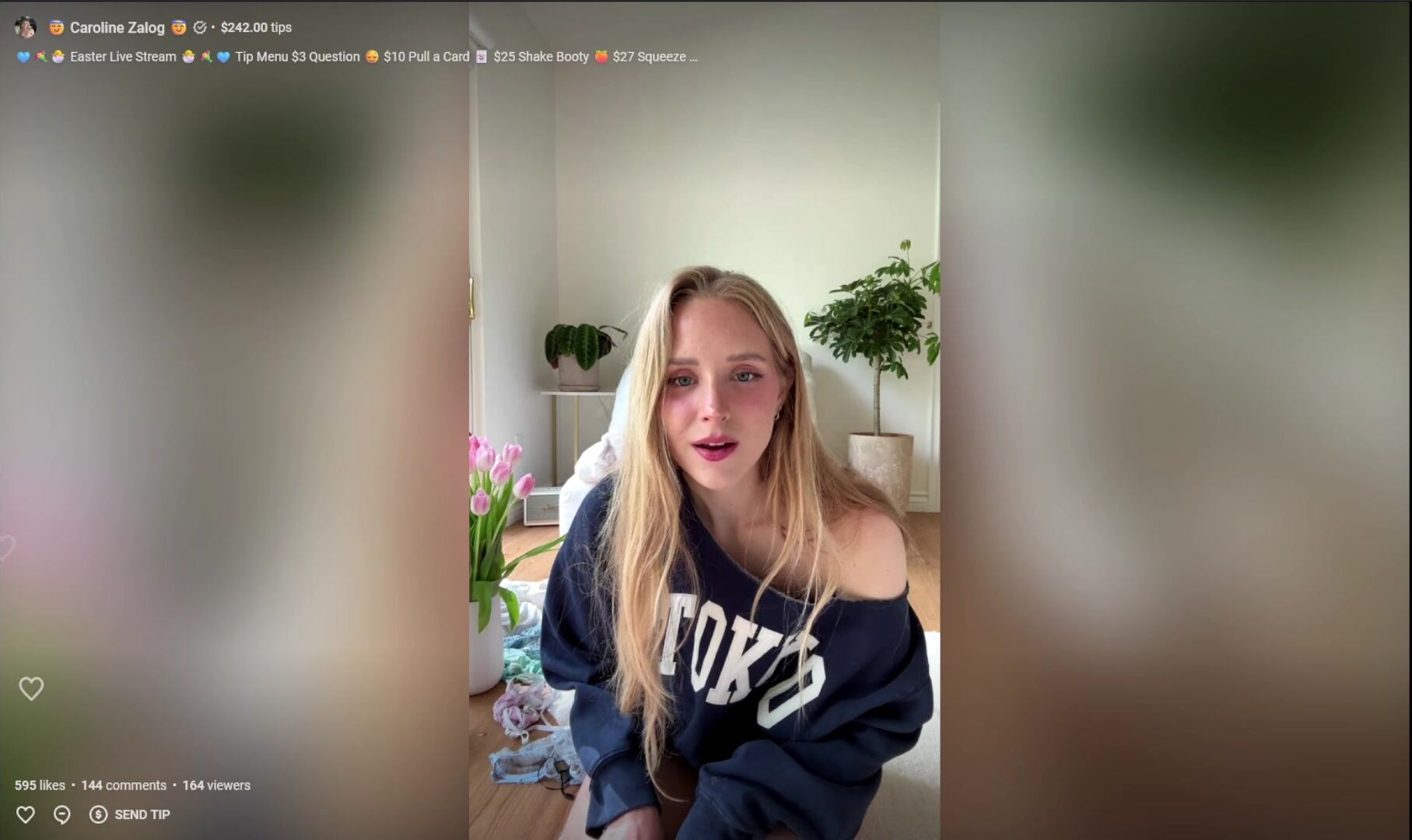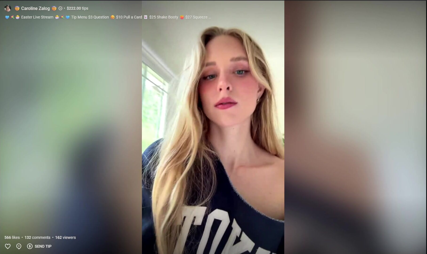 Blonde Caroline Zalog turns up the heat in this live stream video, teasing in blue sweatshirt and red panties while showing her playful side.