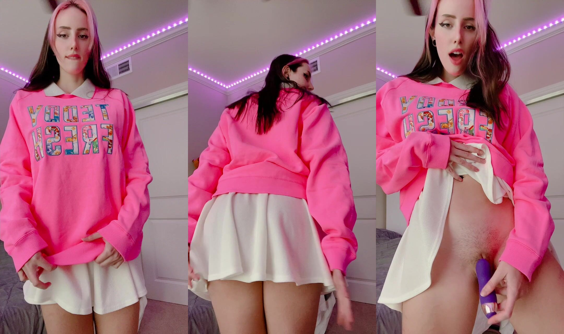 Petite Cutie Morgpie shows her playful side in a pink hoodie and white skirt while teasing with a dildo in this short but steamy masturbation video.