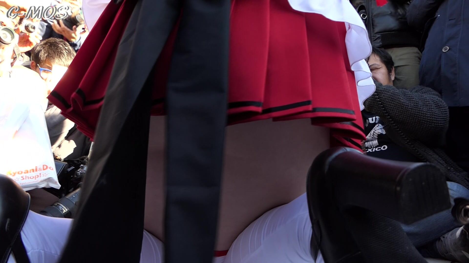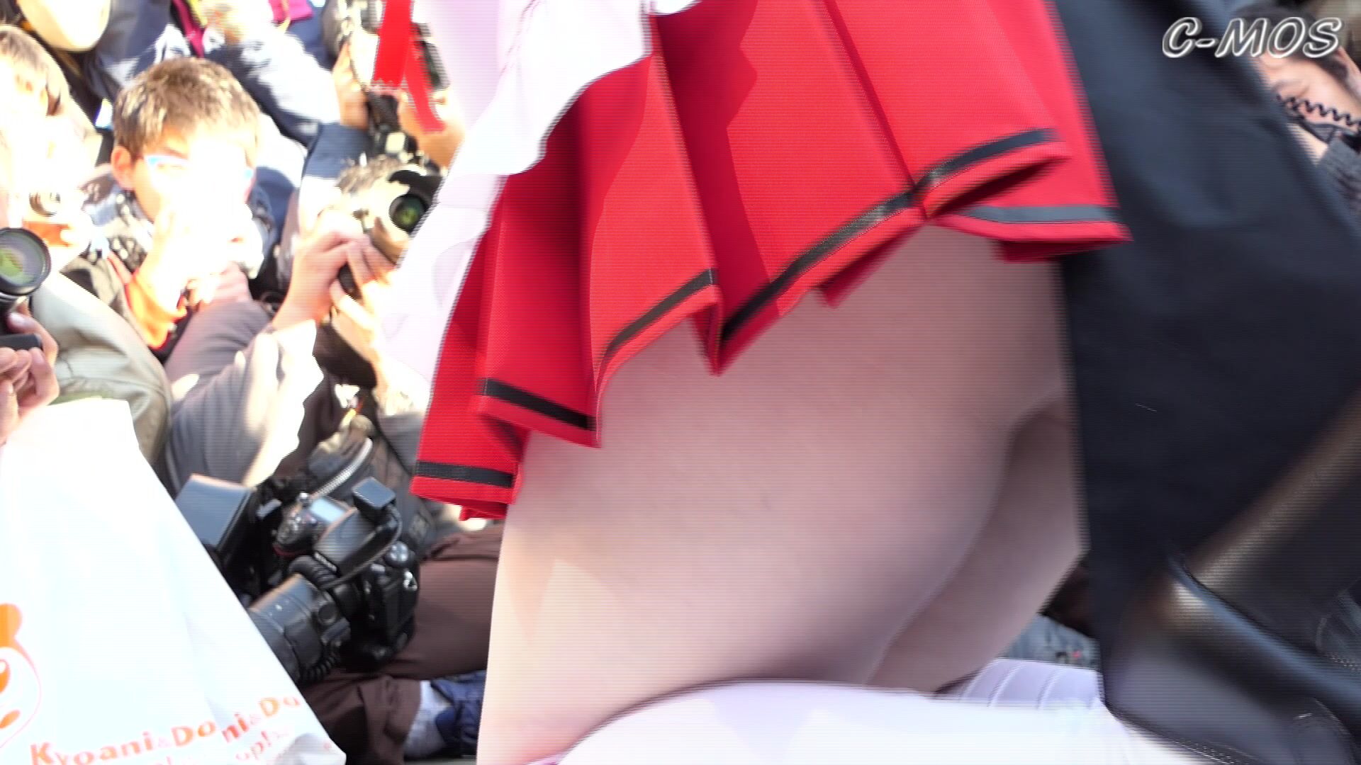 This steaming video features Japanese cosplayer teasing her thick thighs and curves in a public cosplay setting.