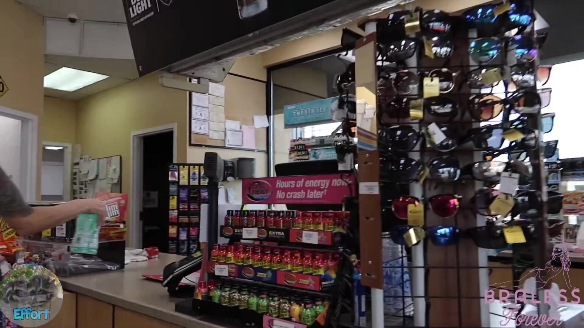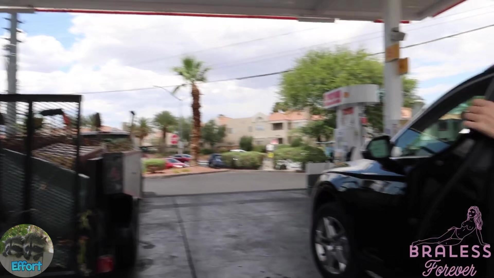 BralessForever stops for gas in this public video wearing a see-through top and short skirt that shows off her thighs.