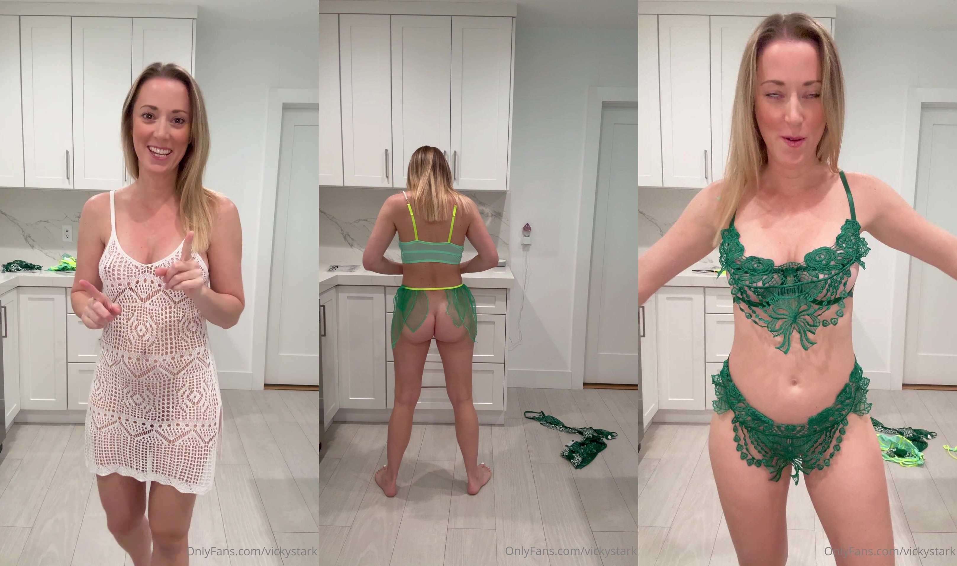 Blonde Vicky Stark shows off her curves in a seductive lingerie set and a revealing dress in this steamy OnlyFans video. Watch as she teases and tantalizes in her kitchen setting, leaving little to the imagination. Perfect for lingerie lovers and fans of teasing content.
