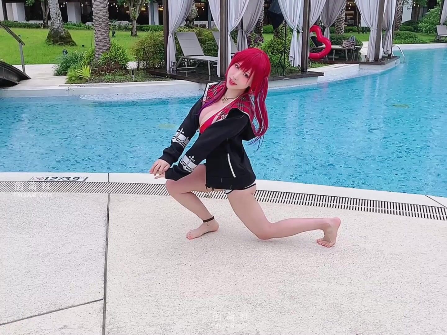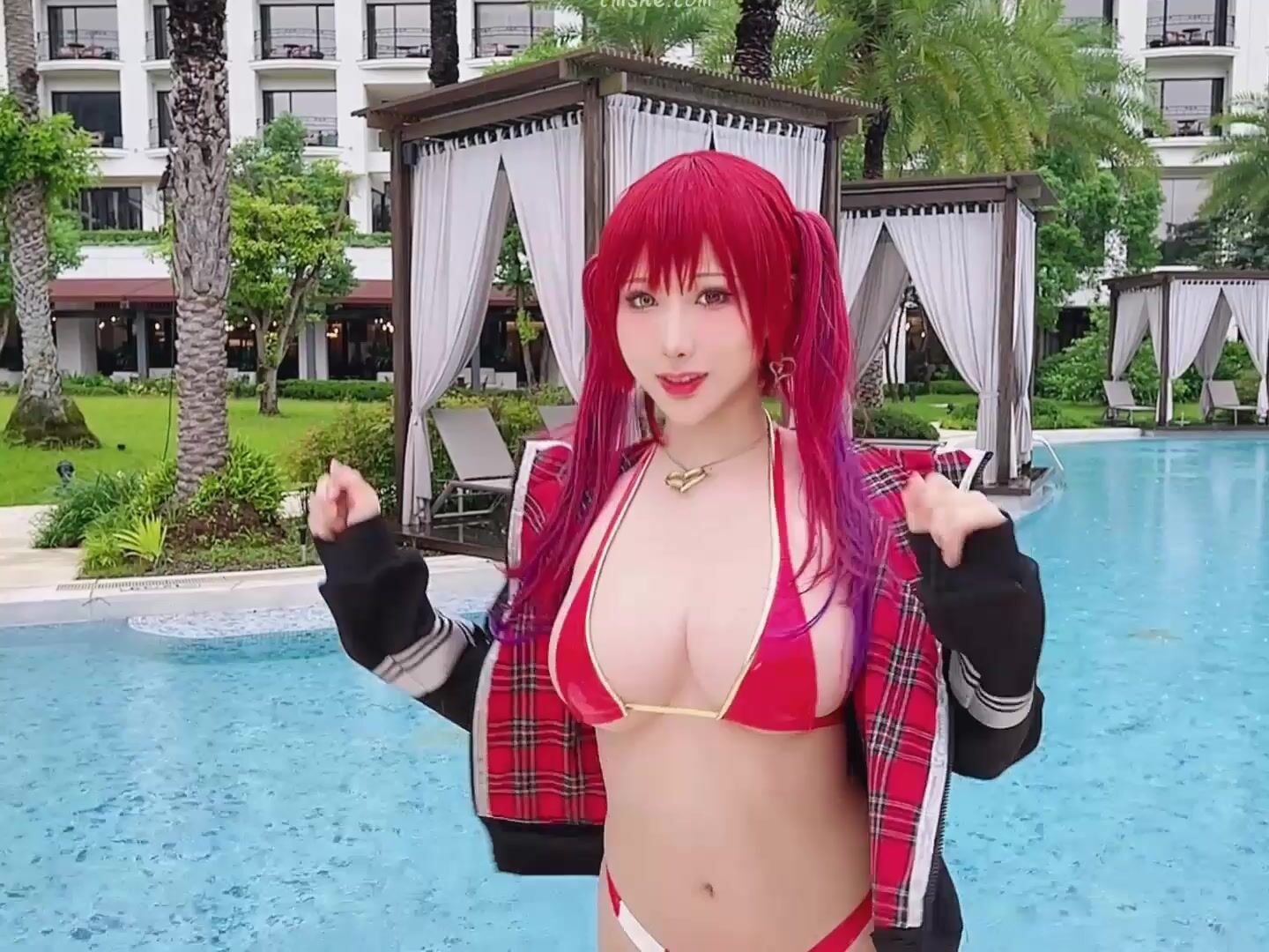 Petite Cutie Haneame__v4 teases in a red bikini and cosplay outfit, showing off her boobs in this poolside video