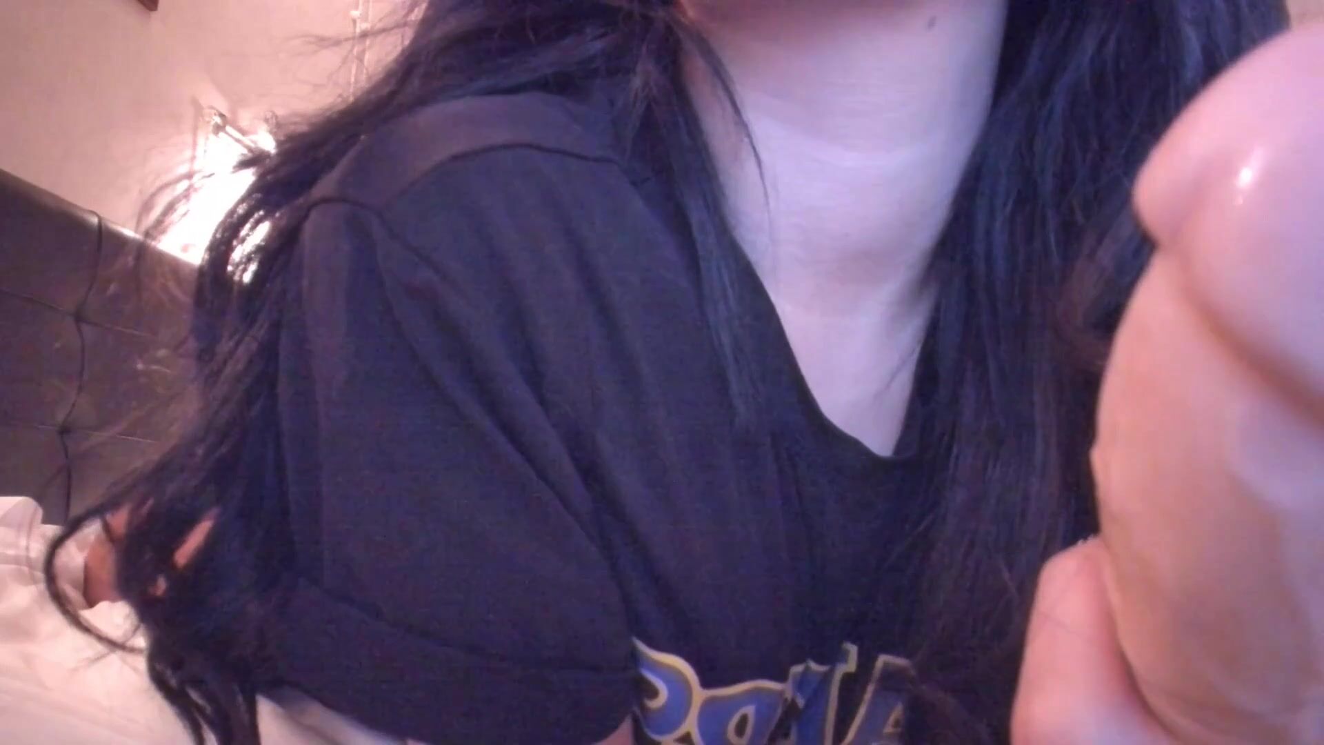 Lusty Asian Chick Deeply Sucking a Big Dildo on Bed Video